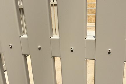 Step 9: Assembly of middle rails, each rail has a cover that matches. The middle rail can easily be identified. It smaller than either bottom rail or top rail. Place cover on rail and put screws on both bottom screw area and top area. Once this has been achieved slide rail into middle holes in each post with the screw cover side is pointing into the enclosure. Place bolts through the post and through the middle rail. Once bolts are in place, place nuts and washers on assembly. Don’t tighten bolt until the entire enclosure is assembled.
