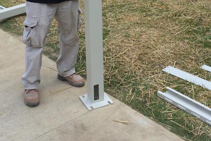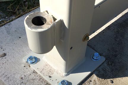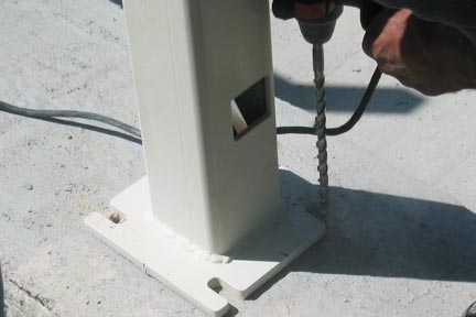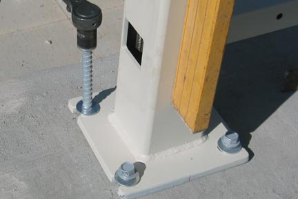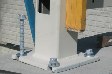 Step 7: Place concrete anchors in each drill hole and tighten within .25” of contact of base plate. This secures the post from falling over, but loose enough to adjust the assembly.