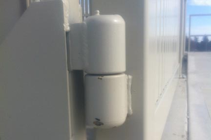 Step 17: Place gate hinge section on post pins. (side frame 7.2) Note: there is a ball bearing which must be placed in each hinge with light grease. After achieving hinge section installation repeat procedure to opposing hinge section.