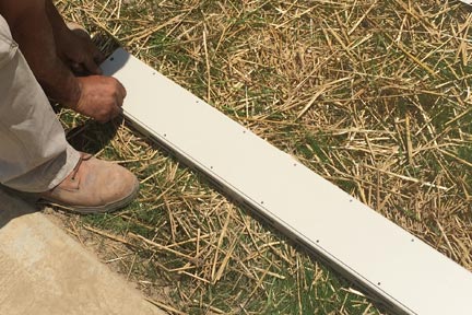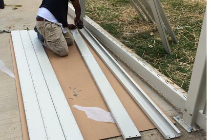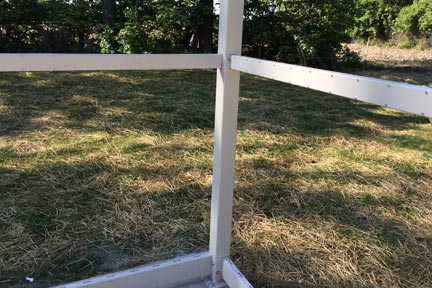 Step 8: Assembly of lower rails, each rail has a cover that matches. The lower rail can easily be identified. It has large drainage openings which face towards the ground. Place cover on rail and put screws on the bottom screw area only. Once this has been achieved slide rail into bottom holes in each tube with the screw cover side is pointing in to the enclosure. Place bolts through the post and through the bottom rail. Once bolts are in place, place nuts and washers on assembly. Don’t tighten bolt until the entire enclosure is assembled.