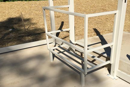 Step 8: Assembly of lower rails, each rail has a cover that matches. The lower rail can easily be identified. It has large drainage openings which face towards the ground. Place cover on rail and put screws on the bottom screw area only. Once this has been achieved slide rail into bottom holes in each tube with the screw cover side is pointing in to the enclosure. Place bolts through the post and through the bottom rail. Once bolts are in place, place nuts and washers on assembly. Don’t tighten bolt until the entire enclosure is assembled. While assembling lower rails, install wheelchair platform railing.